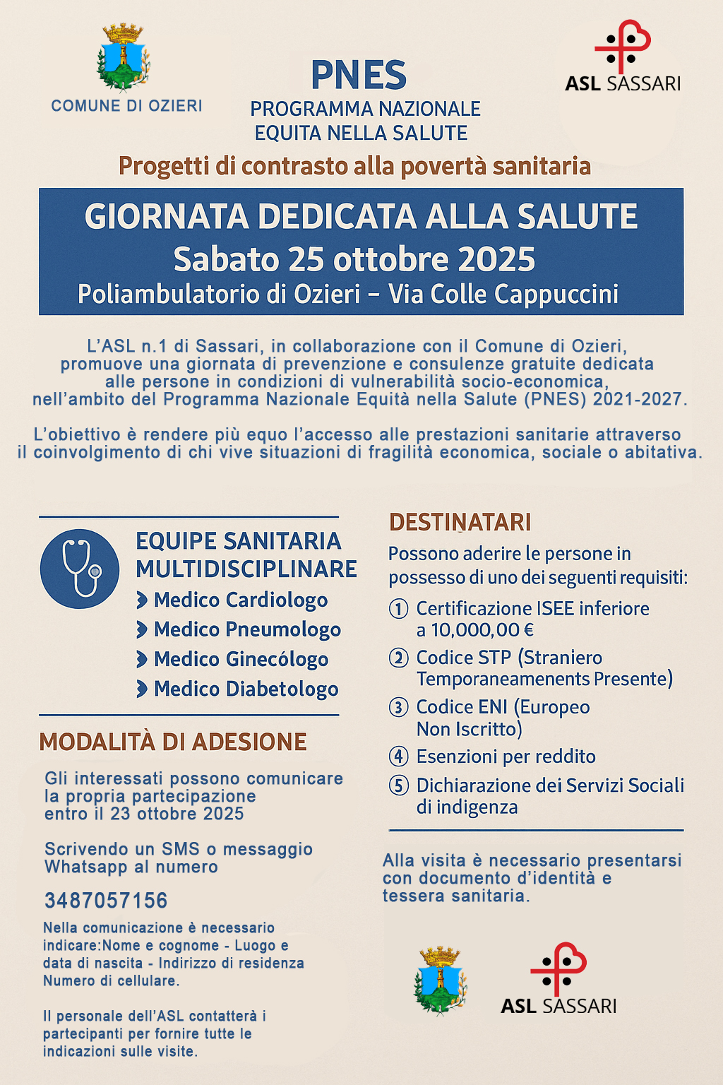 L'ASL n.1 di Sassari, in collaborazione con l’Amministrazione comunale di Ozieri, ha organizzato per il giorno sabato 25 ottobre 2025, presso i locali del Poliambulatorio siti in via Colle Cappuccini, una giornata dedicata alla salute con un’equipe sanitaria multidisciplinare che offrirà consulenze e visite mediche specialistiche. L'iniziativa prevede la partecipazione dei seguenti specialisti: